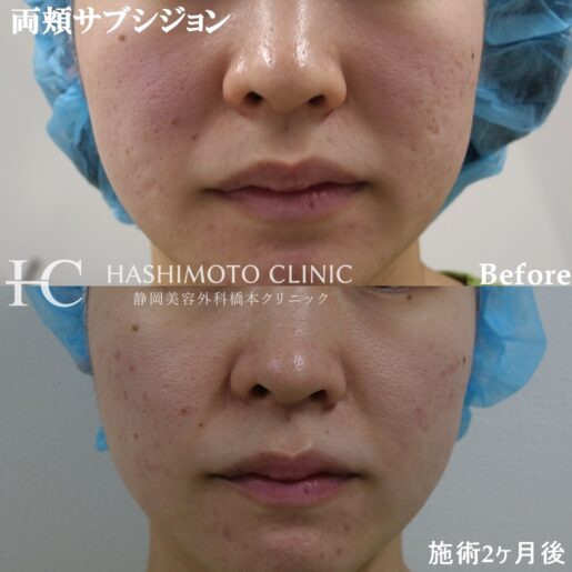 特に治療歴のない27歳女性です。この方はボックスカー型やアイスピック型が多く治療が手ごわいとされていますが、当院のスリーミックスサブシジョンならご覧のように角ばっているタイプでも浅く目立たなくすることができます。