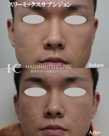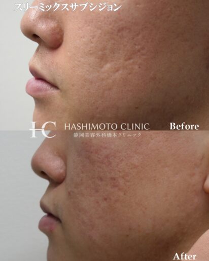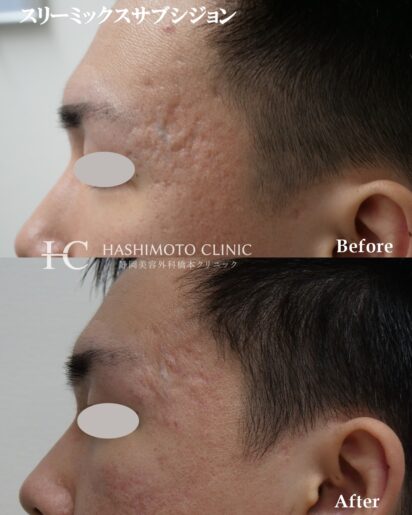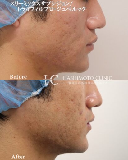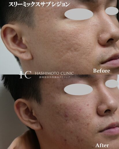 高校生の時にニキビに悩まされていた22歳男性です。スリーミックスサブシジョンとトライフィル&ジュベルックで深いへこみも治療後には一目瞭然の結果となりました。