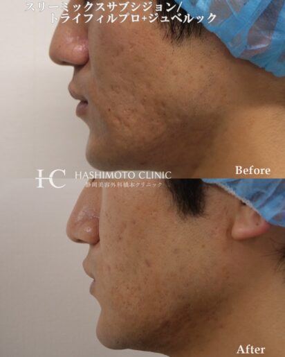 広範囲にわたるクレーターで、治療は大変ですがスリーミックスサブシジョンとトライフィル&ジュベルックで劇的にクレーターと肌質が改善しました。