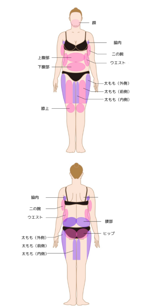 また、顔や二の腕、太もも、お腹など、皮下脂肪があれば部分的に施術を受けられます。