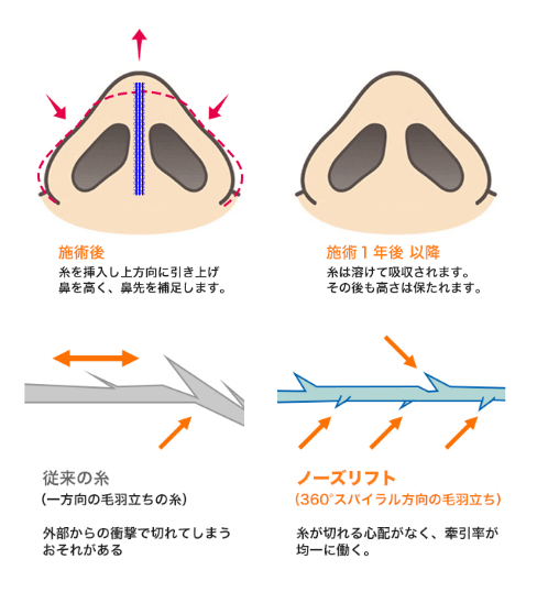 ノーズリフトで使用する糸は特殊な吸収糸で、360度スパイラル方向に毛羽立ちがあり適切な深さで加工されているので、糸が切れることがなく均一に皮膚組織を引き寄せることができます。 使用する糸は吸収糸なので1年程度で吸収されますが、その間に線維化するため牽引力は20%~40%が残ります。