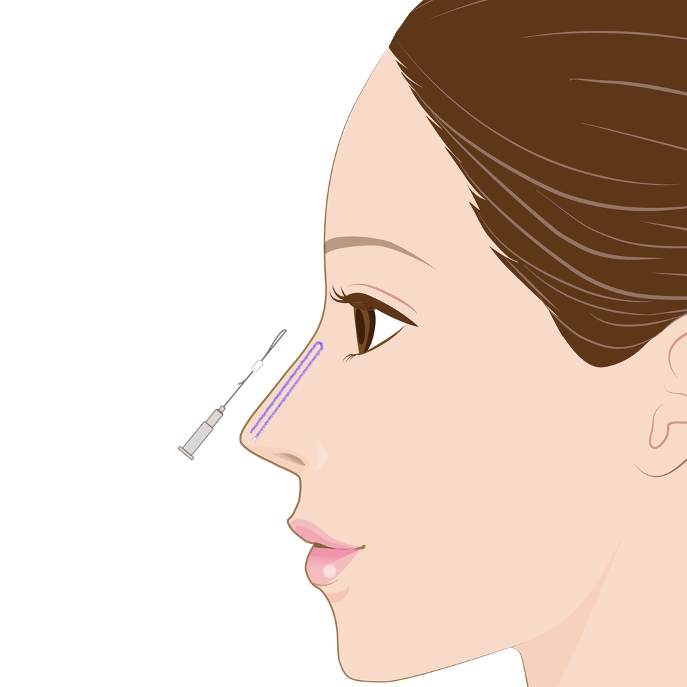 もともと体内にあるヒアルロン酸という成分を鼻に注入することで高さを出す施術です。注入直後から、鼻が高くなったことをご実感いただけます。また、注入する部位や量によって鼻筋や鼻先の形をデザインすることが可能です。最終的には体内に吸収されて元に戻るので、本格的な隆鼻術を受ける前のお試しとしてもとてもおすすめです。