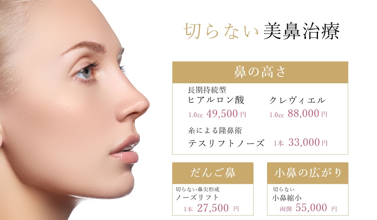 ■施術名:ヒアルロン酸隆鼻術 ■施術の説明:ヒアルロン酸を鼻に注入することで高さを出す施術です。 ■施術の副作用(リスク):だるさ・熱感・頭痛・蕁麻疹・痒み・むくみ・発熱・咳・冷や汗・胸痛・鼻の違和感・異物感・鼻閉感:鼻尖、鼻翼、鼻骨、わし鼻・仕上がりがイメージと異なるなどを生じることがあります。血管閉塞の可能性が起こる可能性があります。 ■施術の価格:1cc 33,000円~88,000円