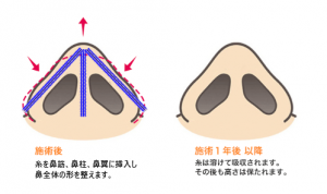 特殊な毛羽立ちのある糸を挿入し、皮膚組織を引き寄せて鼻のラインをデザインする「切らない鼻尖形成」とも言われています。 鼻先の方向や高さを自由な方向に引き上げることができるため、ご希望にあわせた鼻のラインを形成することが可能です。 美しく自然な鼻のラインを作る事ができ、仕上がりもナチュラルなのが特徴です。