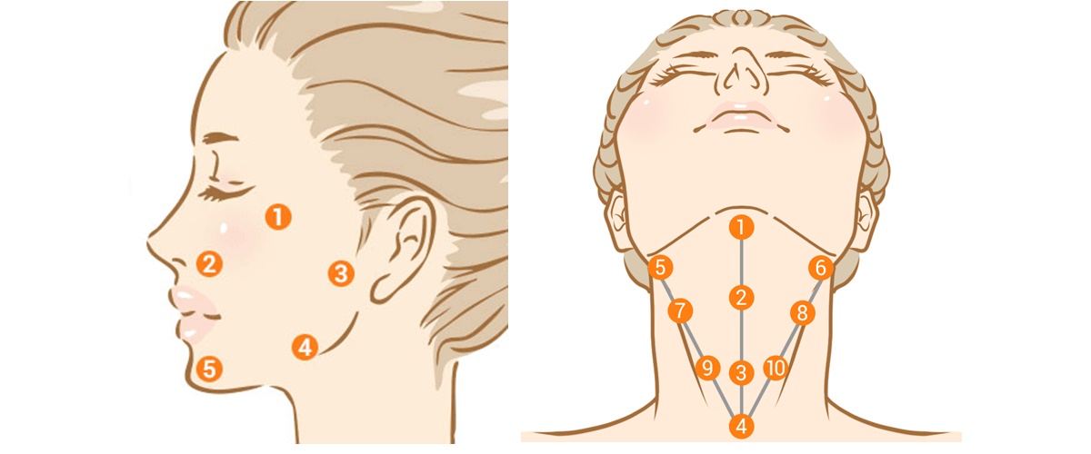 顔や首の主要血管未収部位やリンパ節密集部位10カ所に少量ずつ浅く注入することで、皮膚全体の質が改善され、効果が6ヶ月持続します。