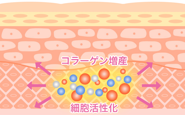 それによりコラーゲンやエラスチンが増生され、肌にボリュームやハリ、弾力を取り戻し、自然なリフトアップ効果や肌のエイジングケア、シワ改善効果、美白効果を得られます。