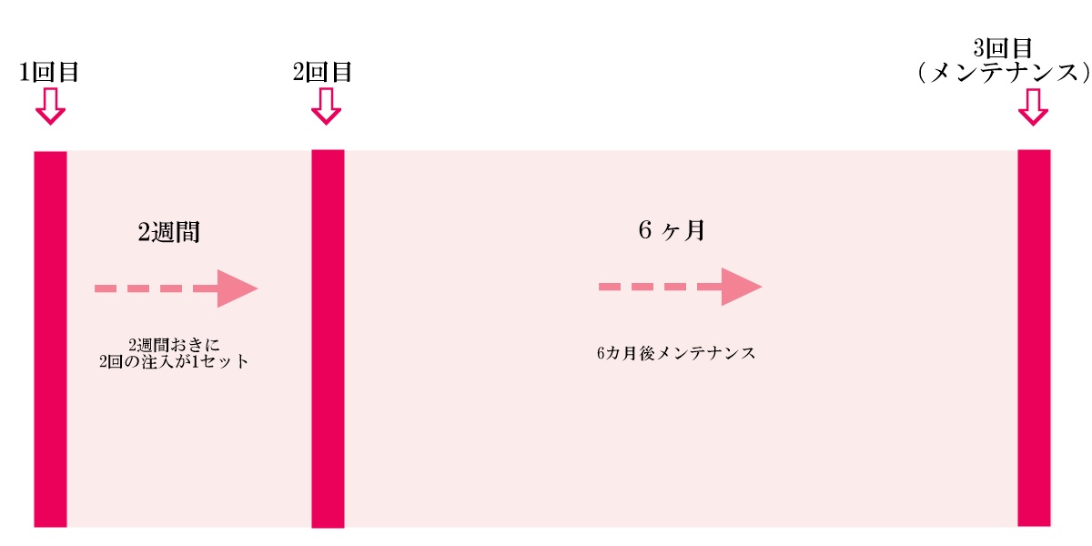 治療は2週間おきに2回の注入が1セットとなり、 その後6カ月ごとのメンテナンス治療が推奨されています。