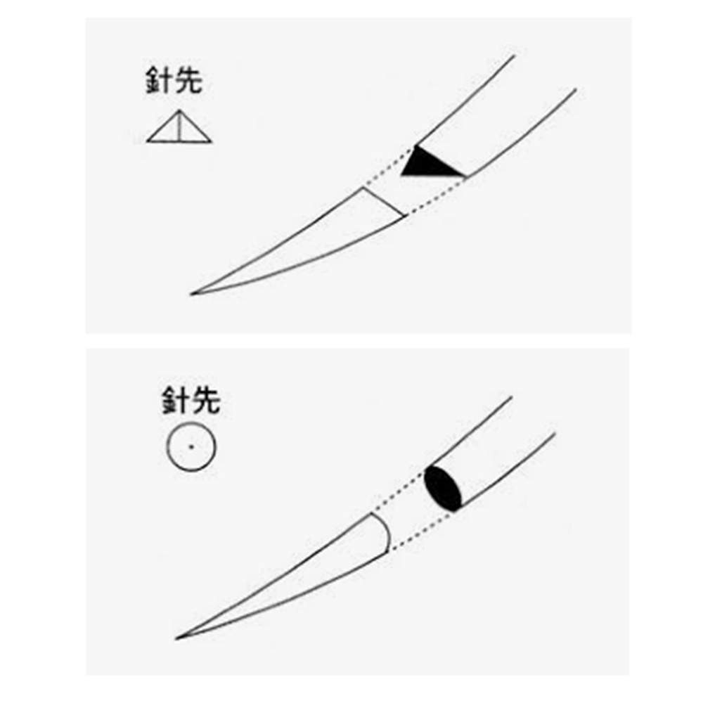 埋没糸を通す際に用いる針を角針ではなく丸針を使用しますので、皮膚や毛細血管の損傷を抑えて内出血を起こりにくくします。外科学一般的に皮膚縫合は角針で行い、腸や血管の縫合は丸針を用います。角針は組織貫通性に優れるので操作しやすいですが、組織貫通性が高いため血管損傷のリスクが高くなり結果、内出血、腫れが起こる可能性が高くなります。ですので当院では、皮膚縫合には通常用いない丸針を使用し、少しでもお客様のご負担を少なくする術式で行います。