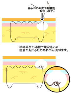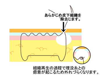 「ナチュラルデザイン法」 は、これに加えて、皮下組織の一部を除去し、除去した皮下組織のくぼみに埋没糸が丁度入るため術後の仕上がりがより自然になります。また、組織再生の過程で埋没糸との癒着が起こるためより外れづらくなります。