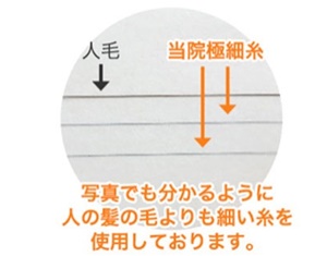 極細高強度の縫合糸を使用します。この糸を使用することで、稀に起こるナイロン糸の加水分解による異物肉芽腫のリスクが無くなります。
