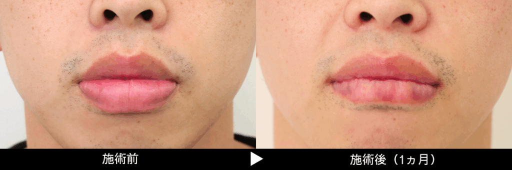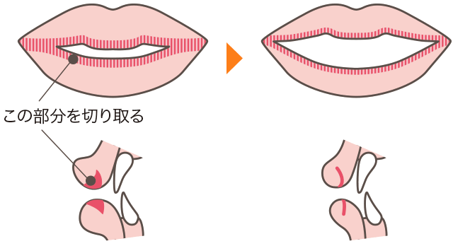 口唇の内側(口腔内粘膜)と外側の境目から粘膜と粘膜下組織を適量切除し薄くします。形成外科的縫合(ほうごう)をきちんと行うことで、唇の傷痕は殆ど分からなくなります。