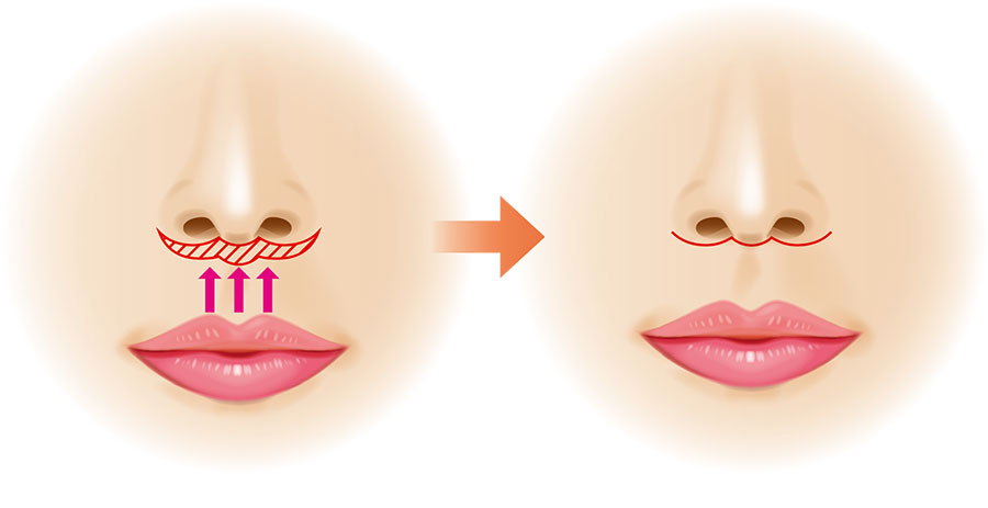 鼻の下の皮膚を数mm切除することで鼻と唇の距離を縮めます。鼻の下が短くなることでお顔が小さく見え、引き締まった印象になります。。