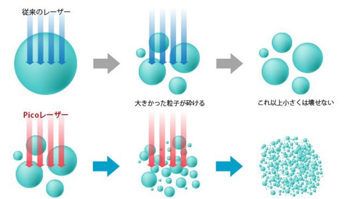 ピコレーザーは秒単位の短いパルス幅で照射を行いますので、周辺組織へのダメージを最小限に抑えることができ、その分熱影響や痛みが軽減できます。