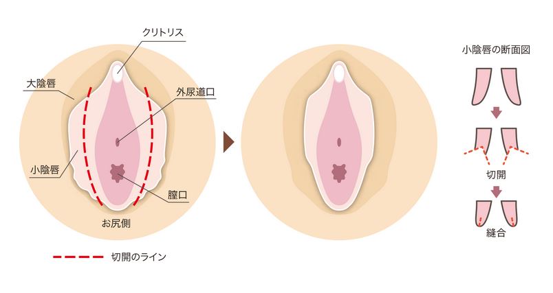 ■施術の説明:メスを使用して小陰唇の余分な部分を切除して縫縮する施術です。