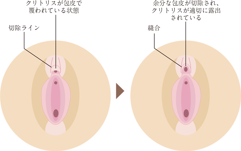 クリトリス(陰核)とは、女性器にある小さな突起部分のことです。 クリトリス(陰核)包茎とは、クリトリスの外側に包皮と呼ばれる皮膚があり、この皮膚が全体的に覆いかぶさっている状態をクリトリス包茎と言います。 クリトリスは、神経が集中していて、快感に影響する部位です。クリトリス包茎の状態では、快感度が低下してしまうほか、垢が溜まりやすくなり、衛生面で問題になることもあります。施術はクリトリスにかぶさっている皮膚の余分な部分を切除して縫合します。吸収糸で縫うため基本的には抜糸の必要はありません。