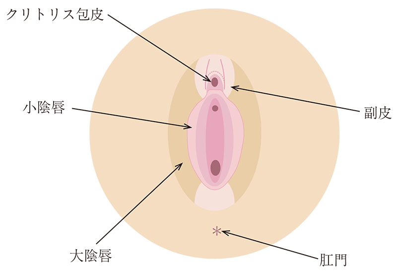 また見た目が良くない、左右のバランスが悪い、といった外見の悩みにつながるケースもあります。 副皮切除術はこうした悩みを解決するために、余分なヒダを切除して女性器の形を整える手術です。小陰唇などと同時に治療する場合も多いです。