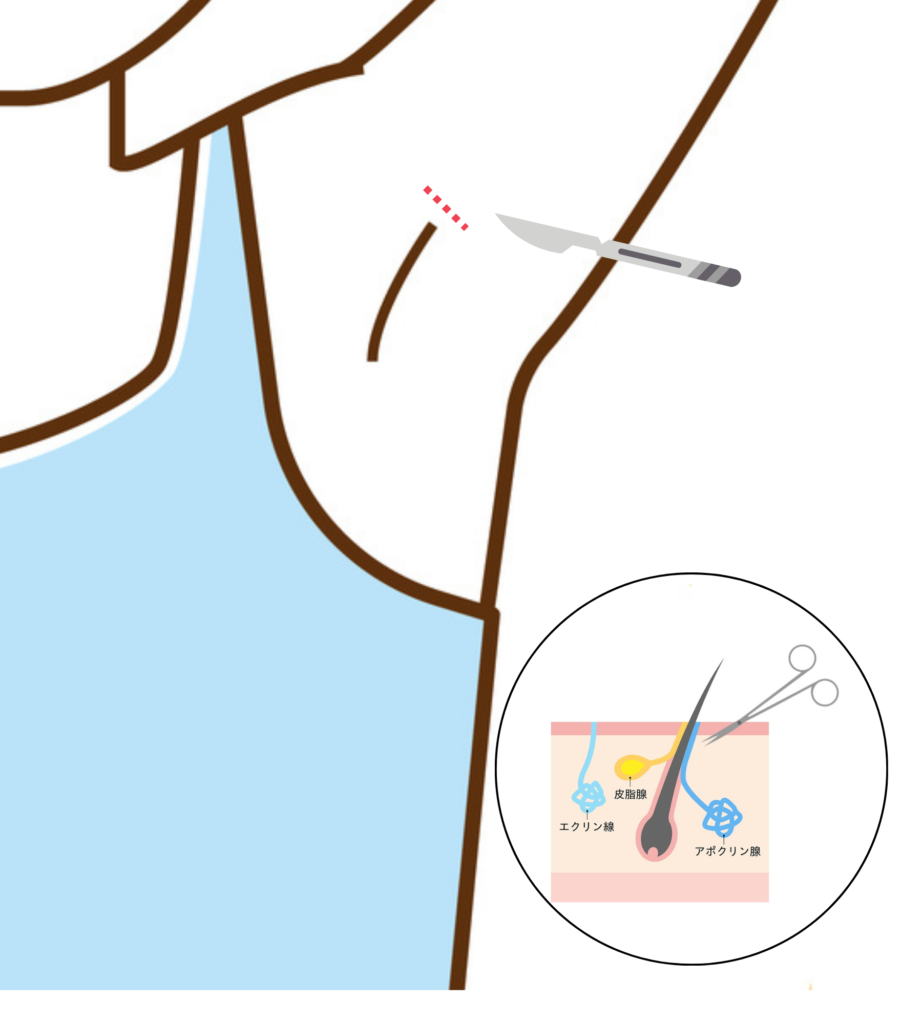 ■施術の説明:外科手術によって、アポクリン腺およびエクリン線の除去を行いわきがを治療する施術です。
